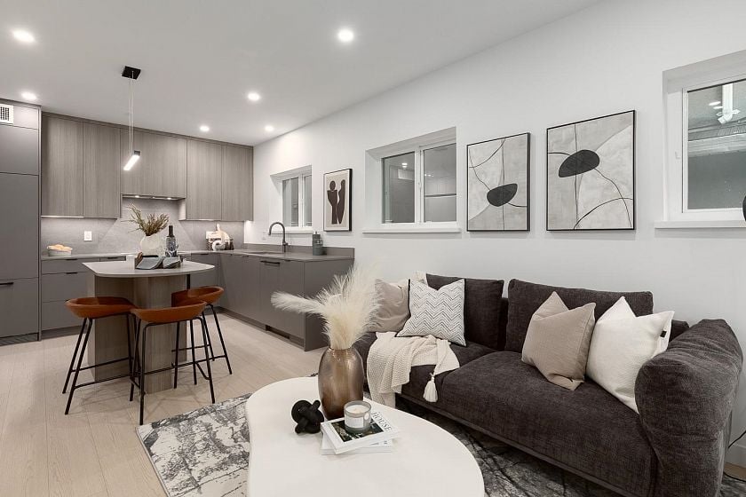 Move in now to The Grove at 34, a boutique community of just 13 homes in East Vancouver created for buyers who want comfort, function, and convenience. This bright 2 bedroom plus den layout gives you an open living space, integrated Fisher Paykel appliances, Italian tiled bathrooms, and a smart floor plan that uses every inch well and keeps life simple and organized. Set on a quiet tree lined street steps from parks, transit, shops, and restaurants, it puts daily essentials within easy reach and keeps the neighbourhood feel strong and welcoming for everyday living and connection. A great fit for first time buyers, and if you qualify under the federal program you may pay no GST. Tour the furnished show suite and secure your home while it is still available today and ready for you.