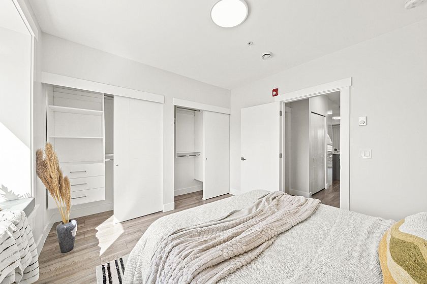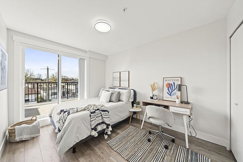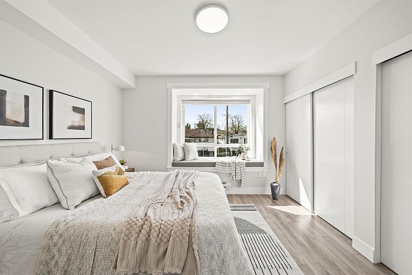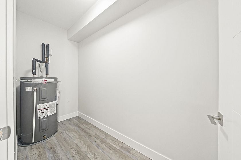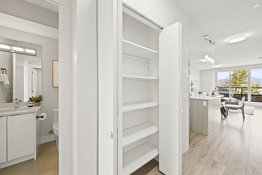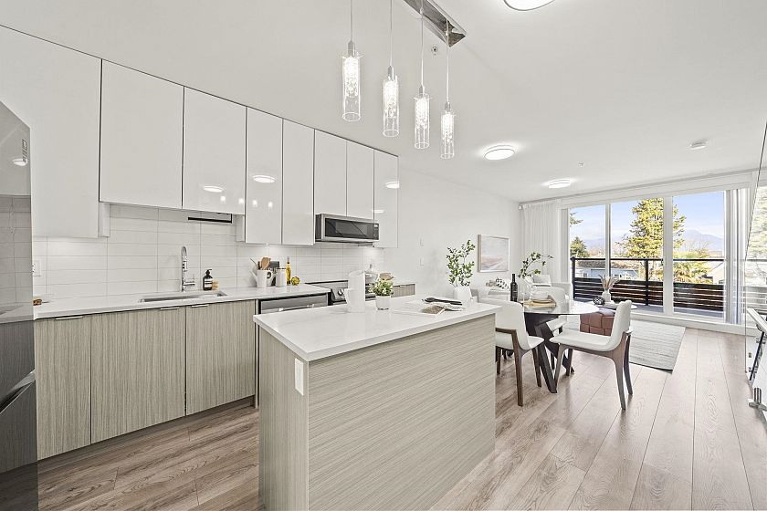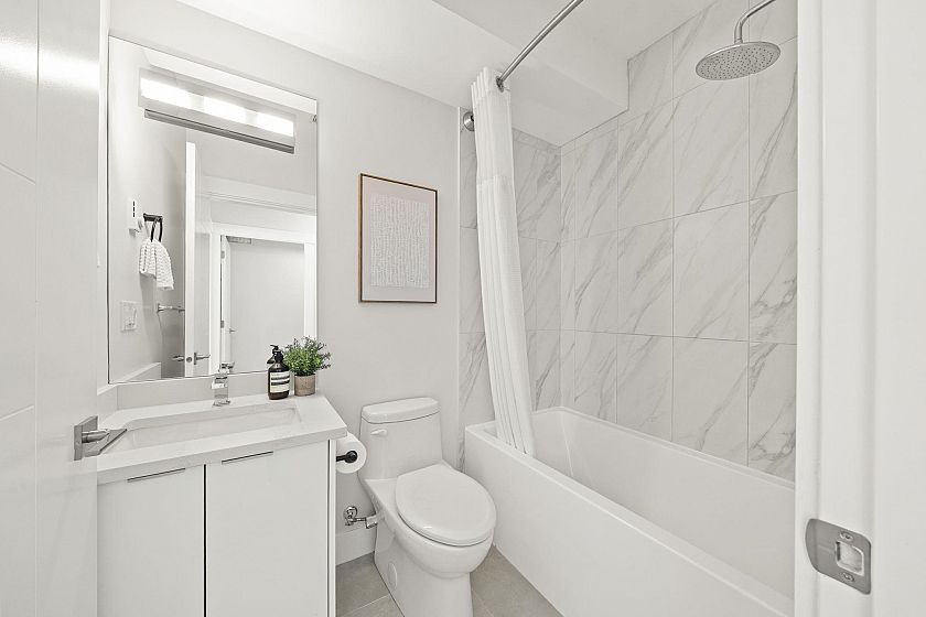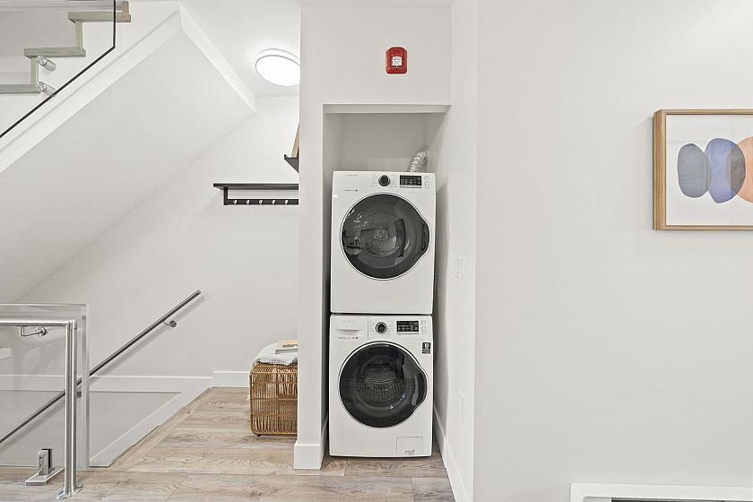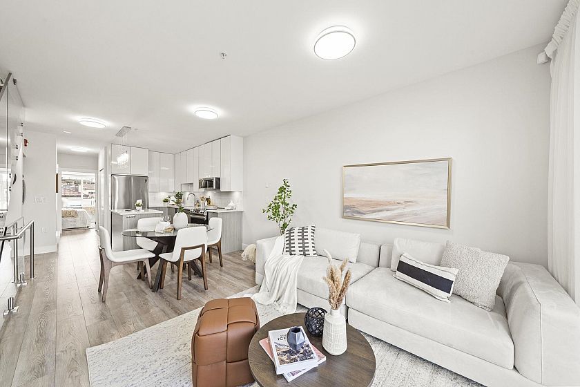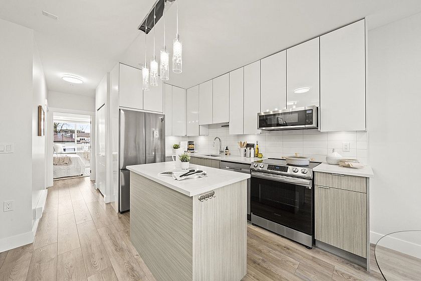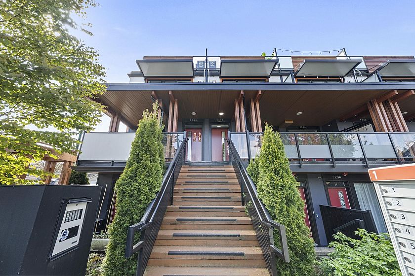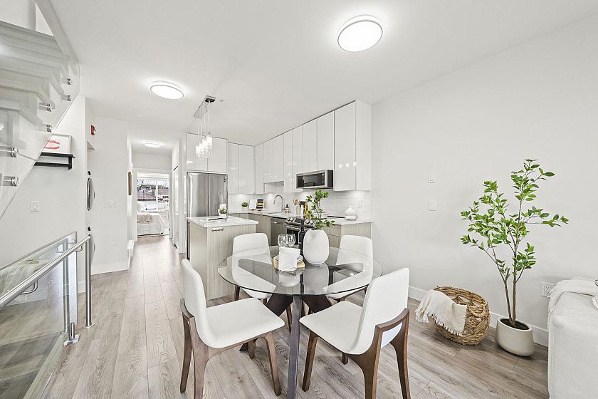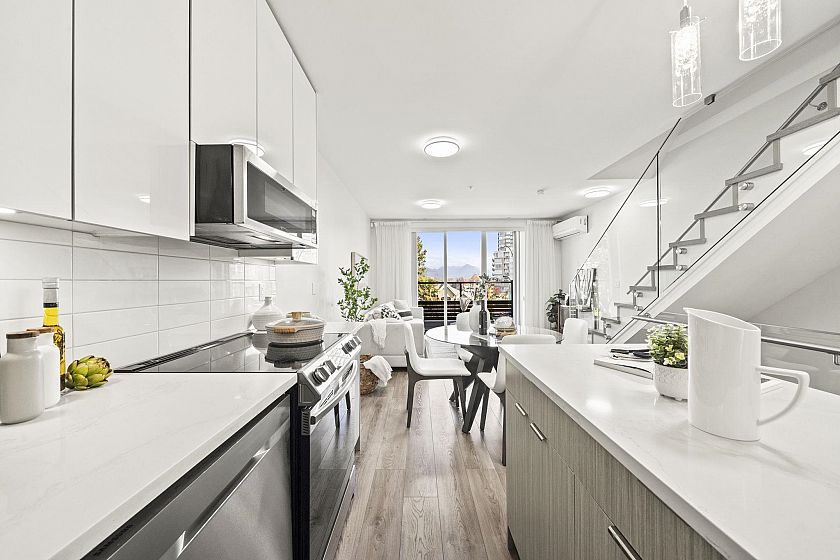 Modern, sun-filled 3-bedroom townhouse offering over 1,200 sqft of thoughtfully designed living space plus an impressive 300 sqft of outdoor space across three decks. Recently refreshed with new paint, this home features a heat pump for year-round comfort with A/C, an open-concept kitchen with a pantry closet, flowing seamlessly into a dedicated dining area and a bright, airy living room that opens onto a BBQ balcony. All 3 bedrooms are generously sized, while the upper level showcases two expansive rooftop decks—one south-facing for all-day sun and the other northwest-facing with stunning mountain views. Includes one EV-ready parking stall, storage on the deck, plus two exterior storage areas. Ideally situated close to transit, amenities and schools for the ultimate convenience.